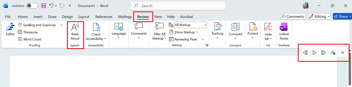 In the imperfect world, I use MS Word’s Read Aloud function (again, many other word processing programs have this function too).