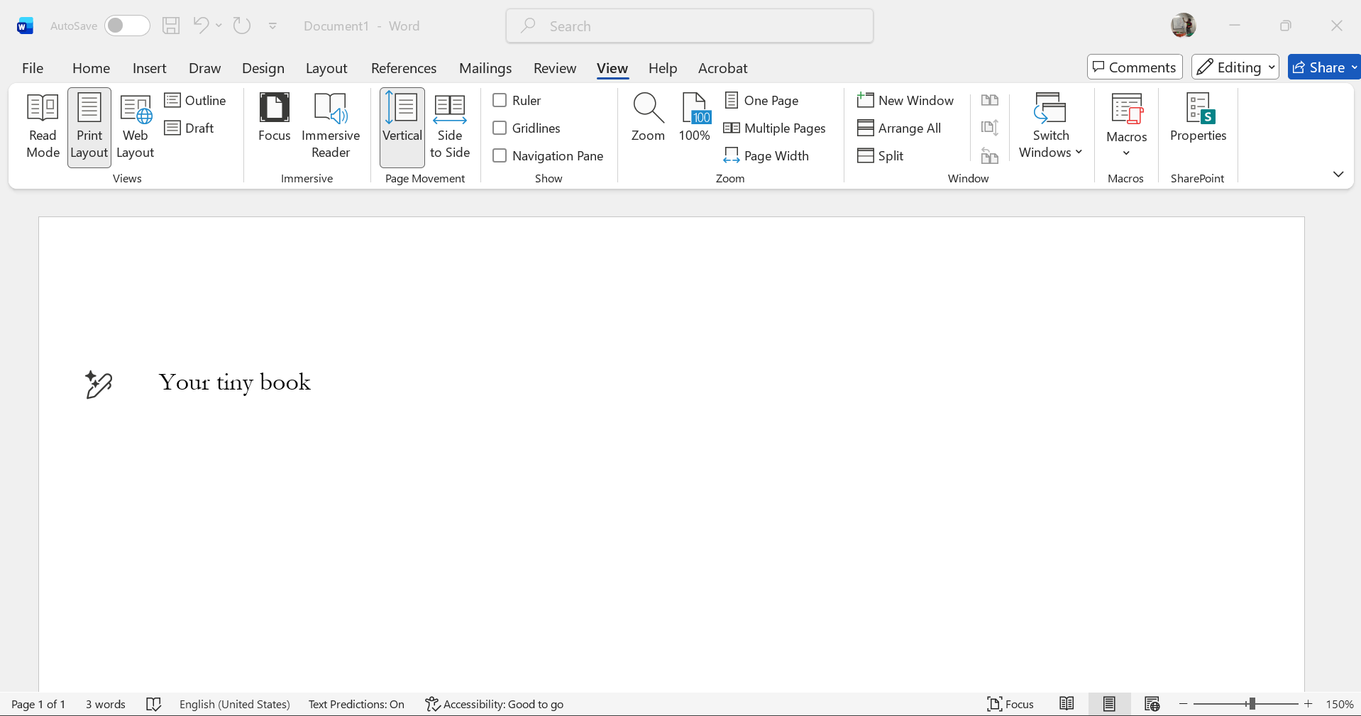 I’m writing my new tiny book in MS Word, and I’m using this function to cut out distractions. (The same function should be available in Google Docs and many other word processing programs.)